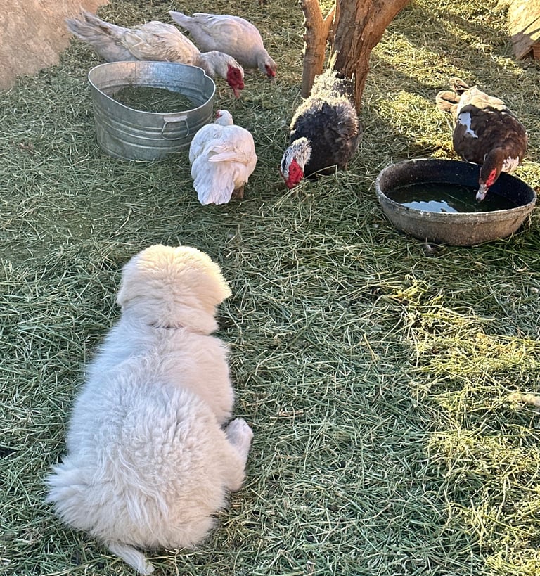 Our livestock guardian puppies are growing up surrounded by poultry, goats, sheep, and other farm friends, learning the instincts that will one day make them trusted protectors.