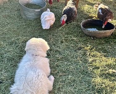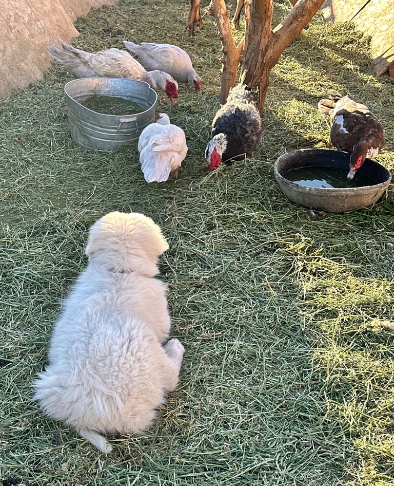 Our livestock guardian puppies are growing up surrounded by poultry, goats, sheep, and other farm friends, learning the instincts that will one day make them trusted protectors.